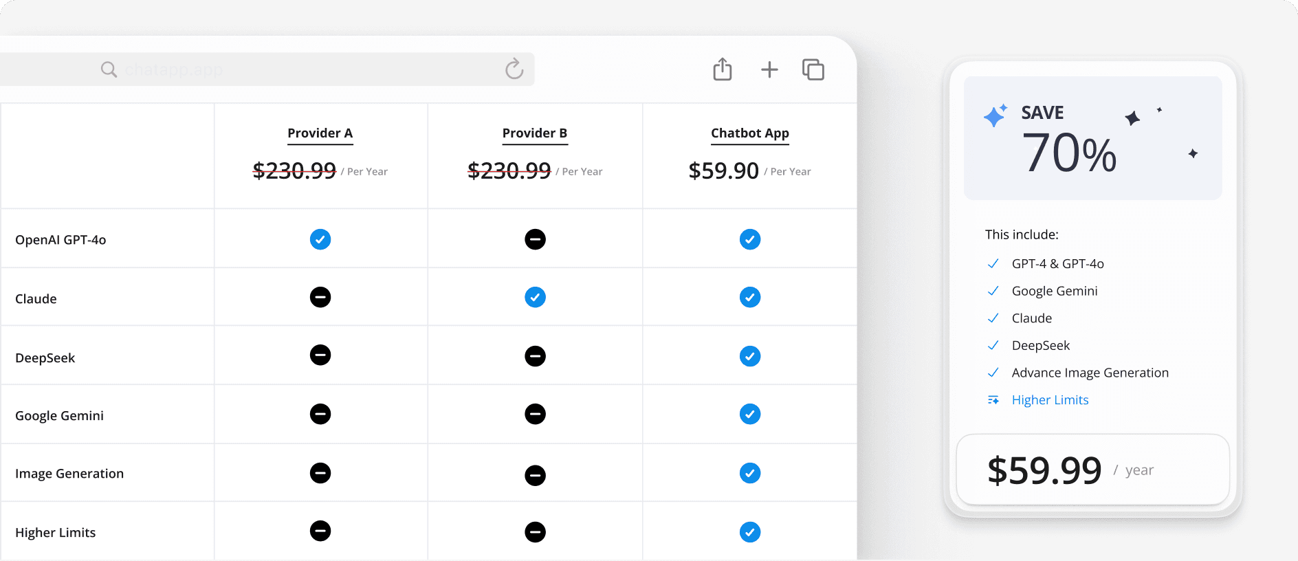 With our $69.99/year subscription, you get GPT-4, Gemini, and Claude – all in one package. Others charge $239.99 for just one model. Maximize your AI experience without the premium price!